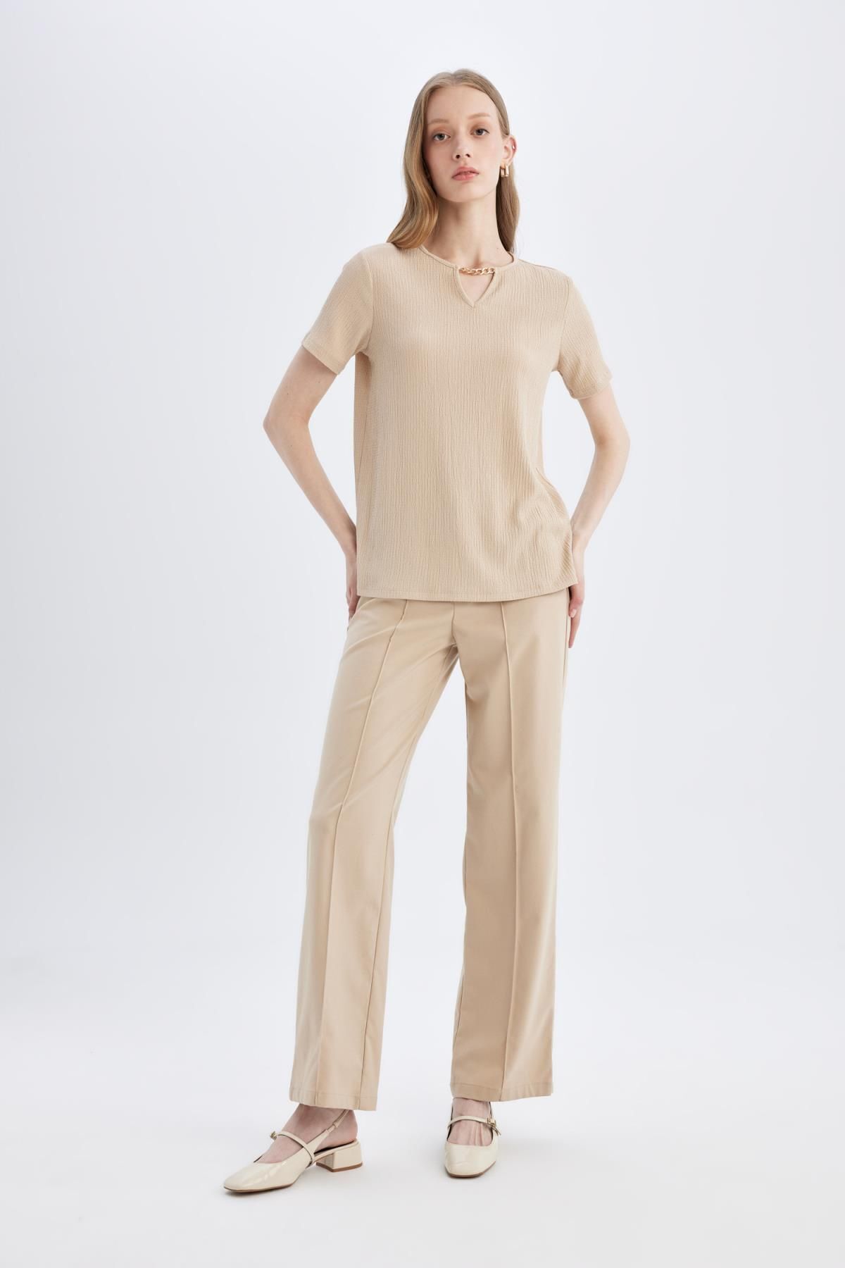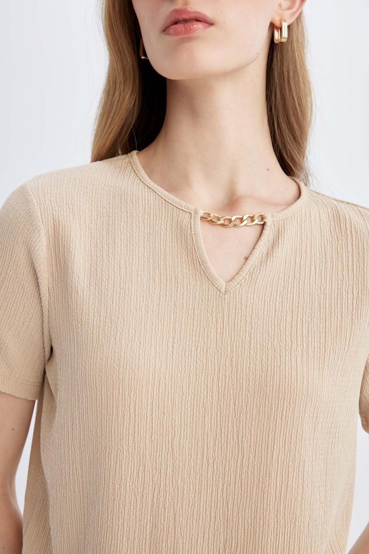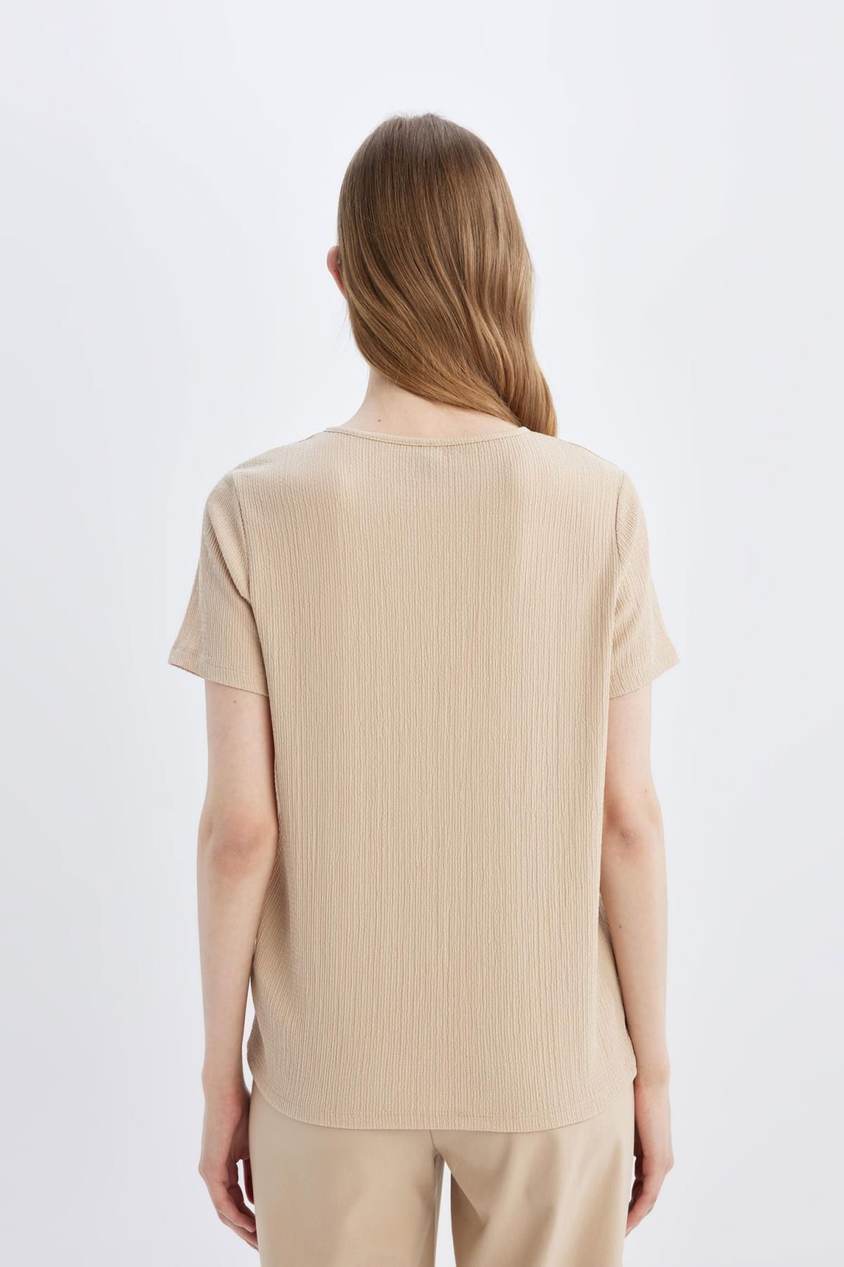 تیشرت زنانه آستین کوتاه یقه گرد ریگولار فیت بژ Defacto
